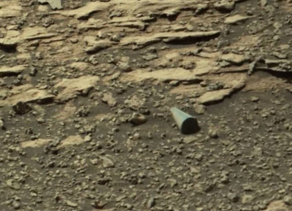 El objeto presenta una forma cilíndrica que se afina hacia uno de sus extremos, con una superficie uniforme y brillante, en claro contraste con las rocas erosionadas y el terreno irregular que domina el paisaje marciano.