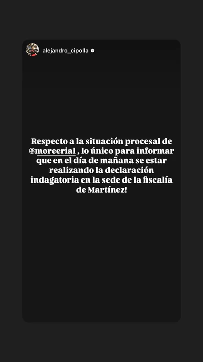 El posteo proviene, originalmente, de su abogado Alejandro Cipolla. En la publicación se puede ver un anuncio por parte del letrado en donde explicó: “Respecto a la situación procesal de ‘@morerial’, lo único para informar que en el día de mañana se estará realizando la declaración indagatoria en la sede de la fiscalía de Martínez”.