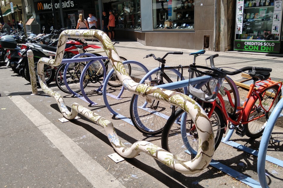 Camila Biondo, también estudiante de Bellas Artes, intervino el bicicletero de San Luis y Paraguay con la ayuda de sus padres que no dudaron en sumarse a esta experiencia en las últimas etapas de cursado de la carrera. “Estoy haciendo la tesis de la Licenciatura, cuando me enteré de que el proyecto ganó me vine en bici, justo, y me puse la canción de Fito A rodar mi vida”, contó. El proyecto fue una inspiración para ella, como ciclista que es: “Ando mucho en bici y están sus beneficios tanto para la salud, como para la ecología. De ahí la idea de reutilizar parte del material”, señaló.