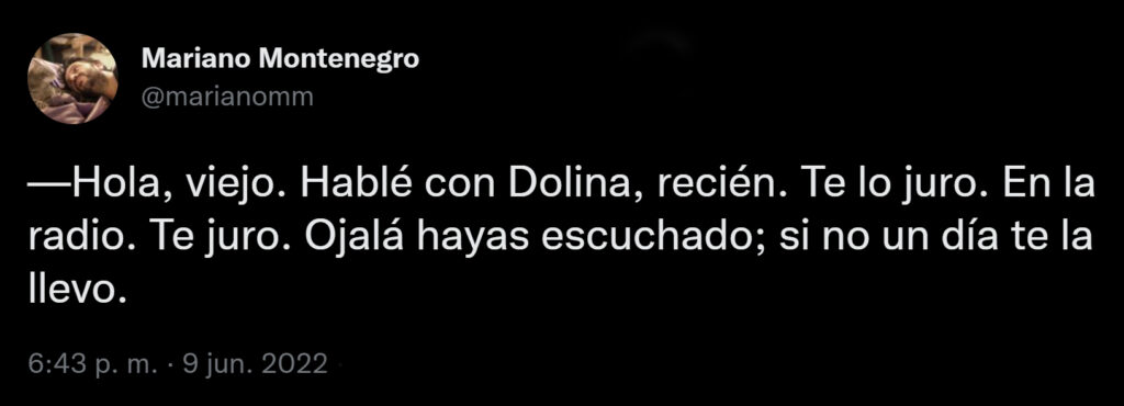 En abril de 2021 le mandé un mensaje por WhatsApp a mi viejo. Le pasé un link y le decía que mire la entrevista que Julio Leiva le había hecho a Dolina. Se la pasé porque me había hecho reír mucho un respuesta que le transcribí: