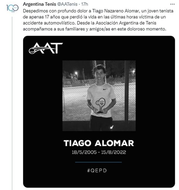 “Despedimos con profundo dolor a Tiago Nazareno Alomar, un joven tenista de apenas 17 años que perdió la vida en las últimas horas víctima de un accidente automovilístico. Desde la Asociación Argentina de Tenis acompañamos a sus familiares y amigos/as en este doloroso momento”, comunicó la entidad en las redes sociales.