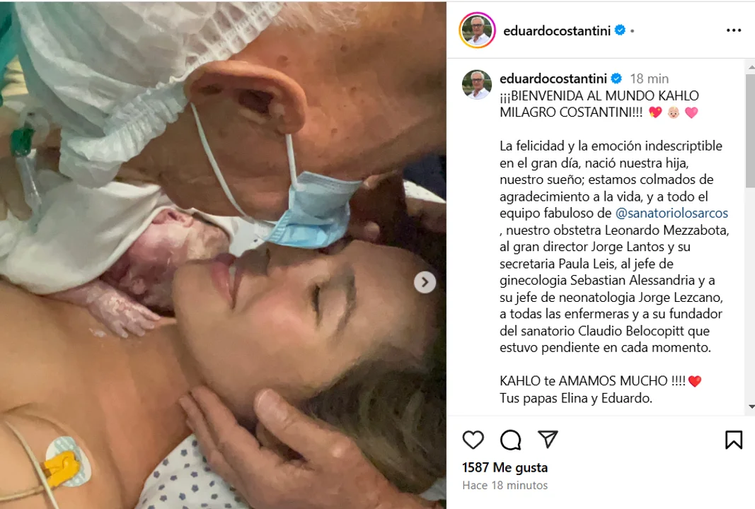 “¡¡¡BIENVENIDA AL MUNDO KAHLO MILAGRO COSTANTINI!!! “La felicidad y la emoción indescriptible en el gran día, nació nuestra hija, nuestro sueño; estamos colmados de agradecimiento a la vida, y a todo el equipo fabuloso de @sanatoriolosarcos , nuestro obstetra Leonardo Mezzabota, al gran director Jorge Lantos y su secretaria Paula Leis, al jefe de ginecologia Sebastian Alessandria y a su jefe de neonatologia Jorge Lezcano, a todas las enfermeras y a su fundador del sanatorio Claudio Belocopitt que estuvo pendiente en cada momento. KAHLO te AMAMOS MUCHO !!! Tus papas Elina y Eduardo”, escribió el empresario de 78 años lleno de emoción.