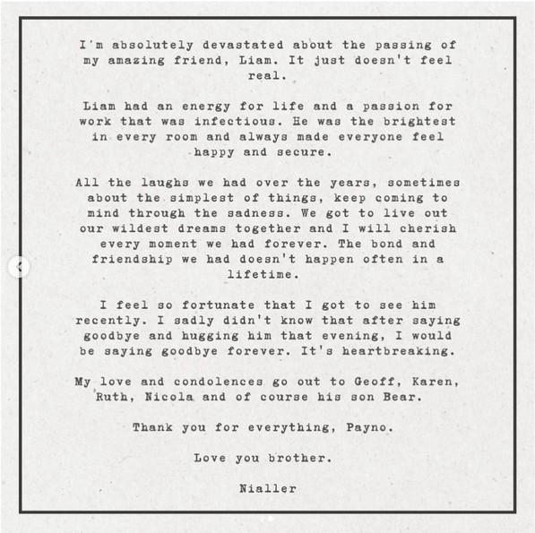 “Es desgarrador. Mi amor y mis condolencias para Geoff, Karen, Ruth, Nicola y, por supuesto, su hijo Bear. Gracias por todo, Payno. Te quiero, hermano”, finalizó Niall.