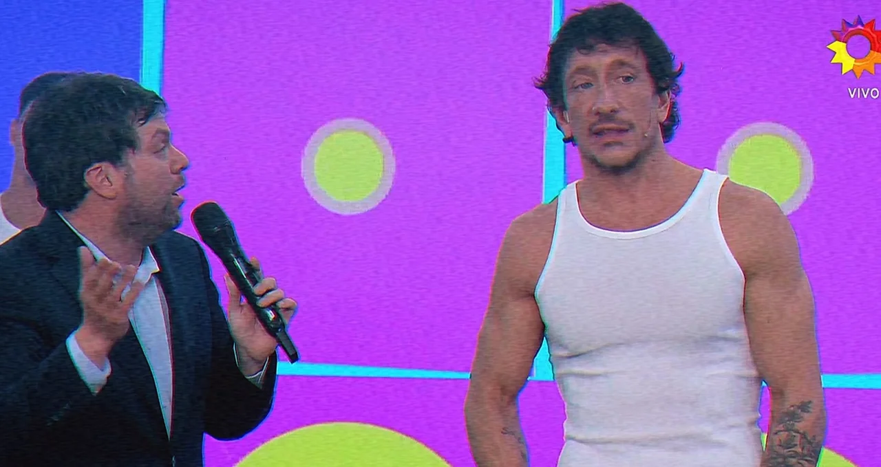 Vestido con una musculosa que dejó ver su trabajado físico —producto de su preparación para interpretar a “Rocky” en el teatro—, se sumó con humor a uno de los juegos del ciclo. “Mirá lo duro que está, locutor”, lanzó entre risas Kaczka, mientras ambos intercambiaban bromas y guiños al aire.