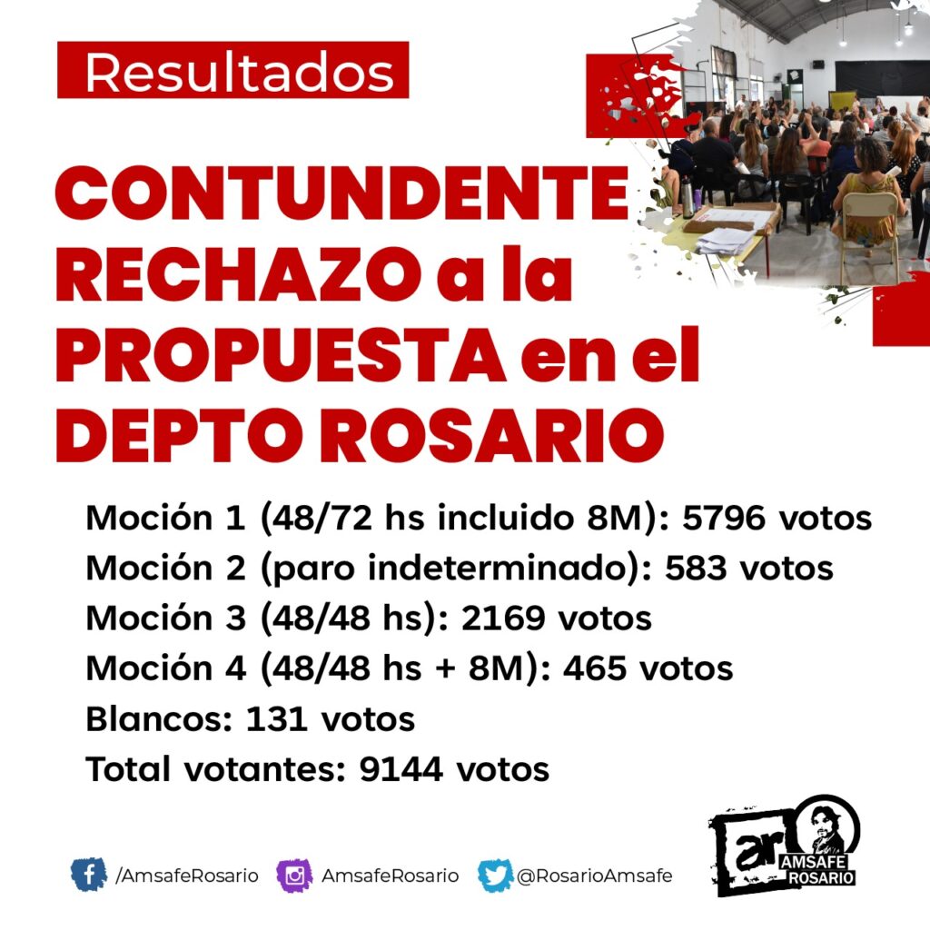 Finalmente, con casi 6000 votos a su favor, la más elegida por el gremio en Rosario fue la moción 1. La misma propone un rechazo a la propuesta por considerarla insuficiente, el no inicio del ciclo lectivo, un plan de lucha provincial con acciones locales y provinciales y paro de 48 horas para el 1 y 2 de marzo y de 72 para los días 7, 8 y 9 del mismo mes.