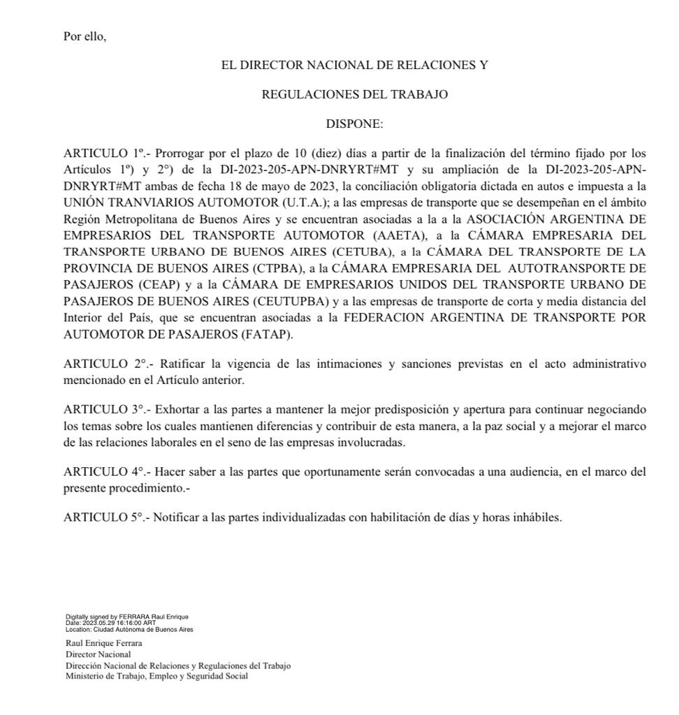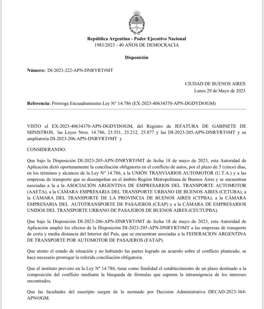 El Ministerio de Trabajo de la Nación comunicó, tras la audiencia prevista para mitad de tarde, que se prorrogó la conciliación obligatoria de transporte hasta el 12 de junio, por lo que este martes habrá transporte normal en todo el país.