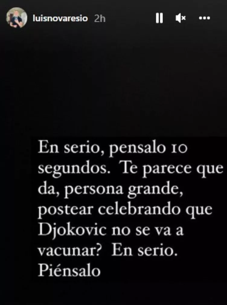 Por medio de una serie de historias en Instagram, el rosarino dejó en claro lo que pensaba. “En serio, pensalo 10 segundos. ¿Te parece que da, persona grande, postear celebrando que Djokovic no se va a vacunar? En serio. Pensalo”.