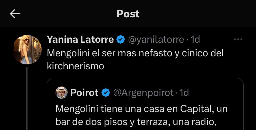 Desde la cuenta de @Argenpoirot, criticaron un video de Mengolini y cuestionaron su discurso sobre las “élites económicas” del país: “Mengolini tiene una casa en Capital, un bar de dos pisos y terraza, una radio, una mansión en el sur con salida propia al lago y es sobrina de unos de los hombres más ricos de Latinoamérica. Élite económica. Ella es parte de la elite económica“, se lee en un tuit. Latorre tomó el guante y escribió: “Mengolini, el ser más nefasto y cínico del kircherismo“.