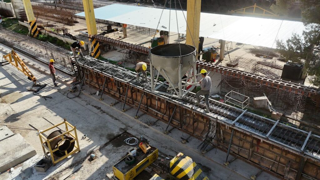 Luego, el hormigonado y el curado acelerado: se vuelca la mezcla de hormigón, preparada en planta y con control de calidad, para asegurar resistencia y durabilidad de las piezas. Una vez hormigonada la viga, se realiza el proceso de curado para acelerar el fraguado y poder desmoldar en 24 horas. Tras un día de curado del hormigón, se produce el desmolde de la primera viga y se repite el mismo procedimiento diariamente, durante 4 días, hasta completar las 4 vigas.