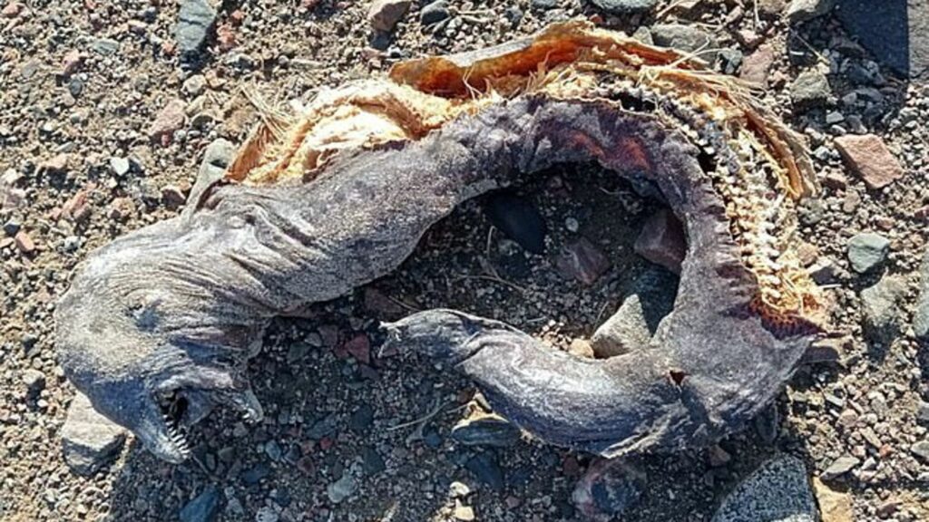 “Lo vi temprano en la mañana cuando regresaba a pie por la orilla. Parecía realmente muerto, la piel estaba seca, gris oscura y con parches. Tiene una cabeza distintiva, con una boca abierta que muestra dientes afilados”, explicó.