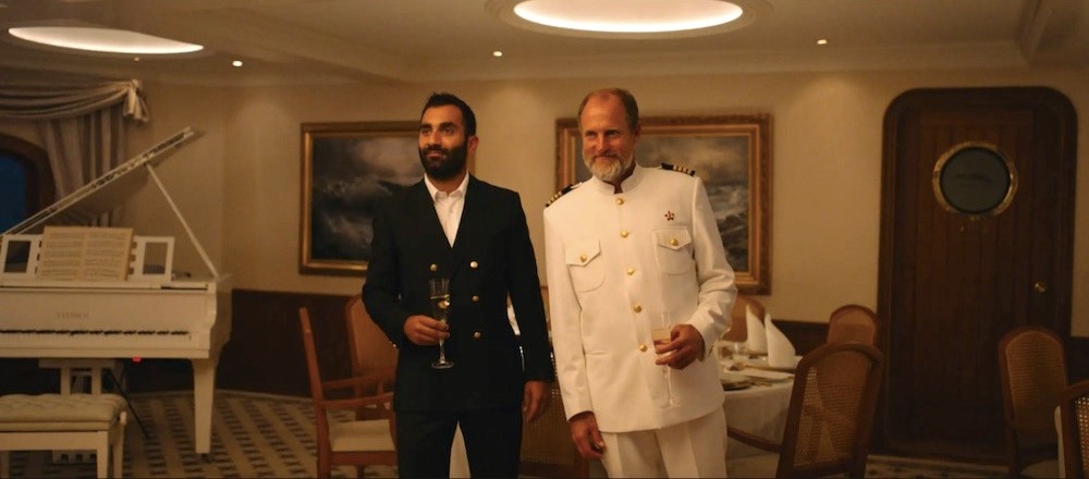 La primera parte tiene como protagonistas a una pareja de jóvenes modelos e influencers (Harris Dickinson y Charlbi Dean) que disputan por cuestiones de dinero (y por lo tanto de poder); la segunda está ambientada en un crucero de lujo cuyo capitán borrachín no es otro que Woody Harrelson y, entre citas a Marx, se produce una tormenta y recibe un ataque de piratas; la tercera, tiene que ver con la supervivencia de algunos pasajeros y tripulantes en una isla supestamente desierta donde las miserias, mentiras y manipulaciones se exacerban y potencias hasta niveles ya insostenibles.