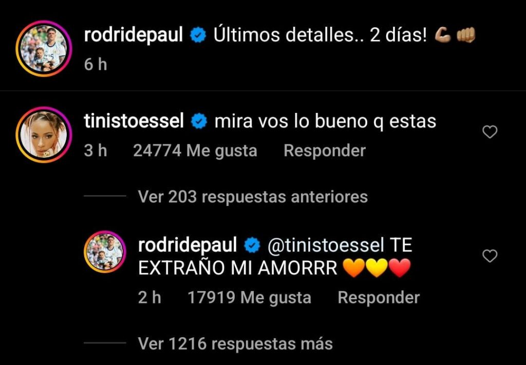 Minutos después que Rodrigo de Paul haya hecho el posteo, Tini Stoessel le contentó: “Mira lo bueno que estas”. Ambos están distanciados hace un tiempo ya que él estuvo concentrado con la Selección y ella está en Buenos Aires haciendo sus conciertos.