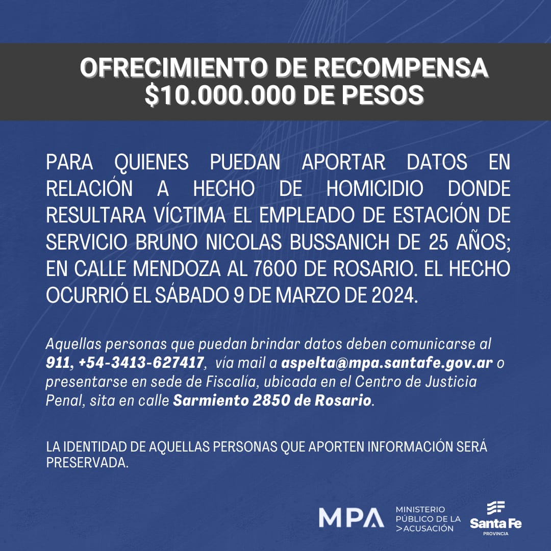 En un comunicado, la fiscalía regional de la Segunda Circunscripción solicitó la colaboración a la población para dar con la persona sindicada como autor del homicidio de Bruno Nicolas Bussanich . El mismo, ocurrió el día sábado en la zona de Mendoza al 7600.A su vez, desde el organismo judicial se informó la recompensa por 10 millones de pesos para aquellas personas que aporten datos que ayuden a esclarecer el episodio.