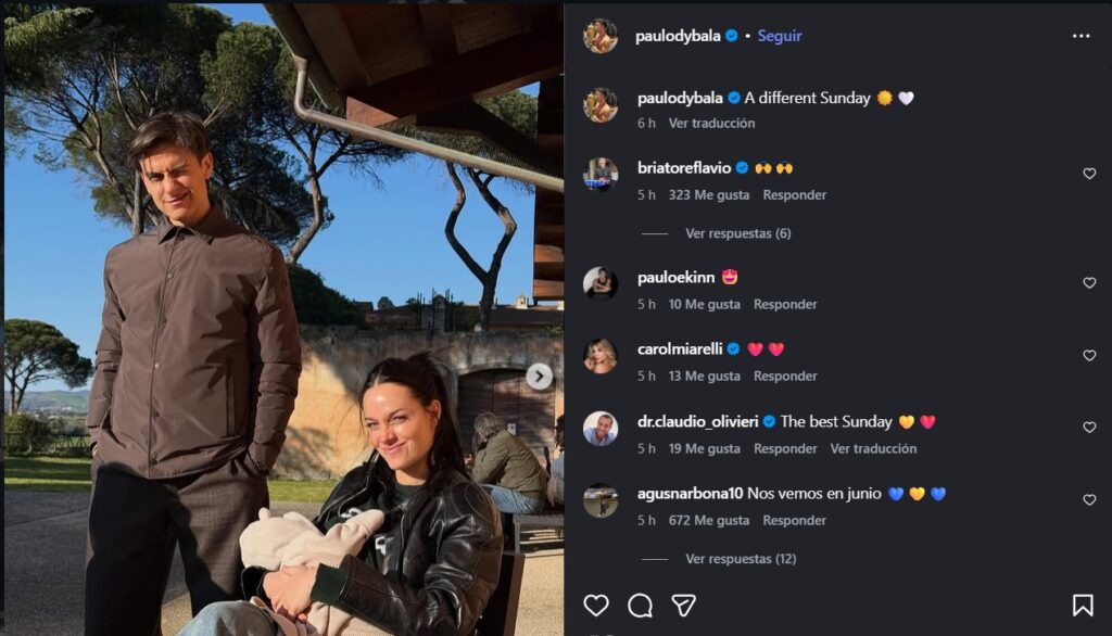 El posteo, realizado en la cuenta de Instagram del delantero de AS Roma, incluyó un carrusel de ocho fotos donde se los ve disfrutando al aire libre, relajados y sonrientes, con la beba en brazos. “Un domingo diferente”, escribió el futbolista, en una frase simple que resumió el significado especial de la jornada.