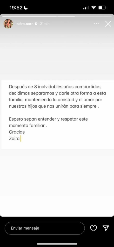 “Después de 8 inolvidables años compartidos, decidimos separarnos y darle otra forma a esta familia, manteniendo la amistad y el amor por nuestros hijos que nos unirán para siempre”, aclaró Zaira en su Instagram.