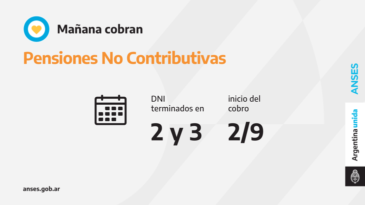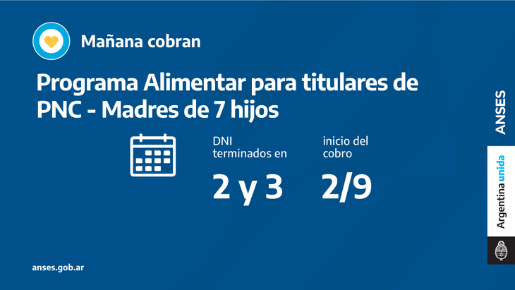 En el marco del Plan Argentina contra el Hambre del Ministerio de Desarrollo Social, la ANSES acompaña con el pago del programa Alimentar. Este jueves cobran Madres de 7 hijos que perciben PNC con documentos finalizados en 2 y 3, no poseen la tarjeta plástica y reciben el dinero en la misma cuenta de la prestación.