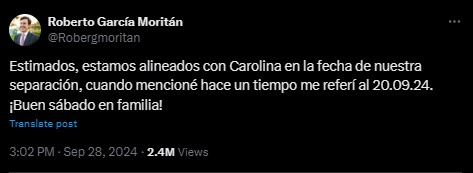 Tras lo publicación de chats de la modelo, Moritán escribió en sus redes retractándose por sus declaraciones y corrigiendo la fecha de crisis matrimonial: “Estimados, estamos alineados con Carolina en la fecha de nuestra separación, cuando mencioné hace un tiempo me referí al 20.09.24. ¡Buen sábado en familia!”.