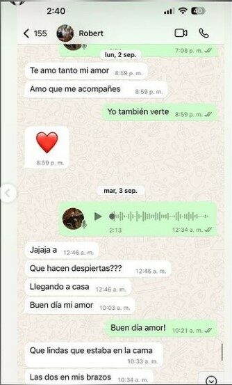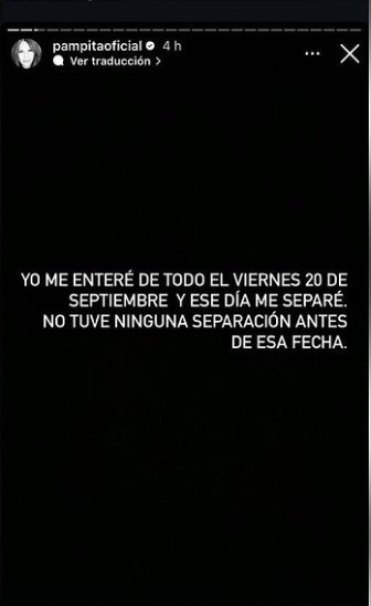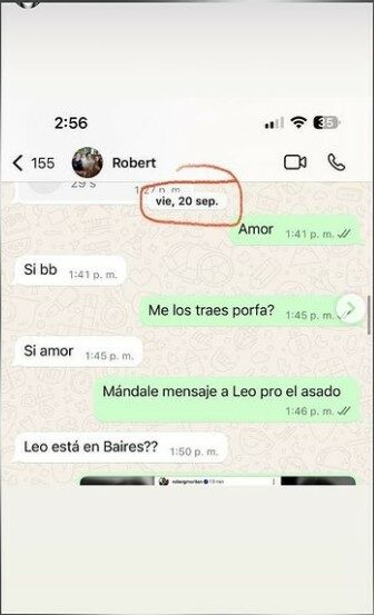 En sus historias de Instagram, Pampita fue categórica: “Yo me enteré de todo el viernes 20 de septiembre y ese día me separé. No tuve ninguna separación antes de esa fecha”, aclaró la modelo, dejando en evidencia la contradicción con las declaraciones públicas de su ex pareja. Para respaldar su versión, mostró capturas de chats desde el 21 de agosto hasta el 20 de septiembre, en los que se puede ver una interacción normal de pareja, con mensajes de amor y afecto como “Buen día amor”, “Te amo”, entre otros.