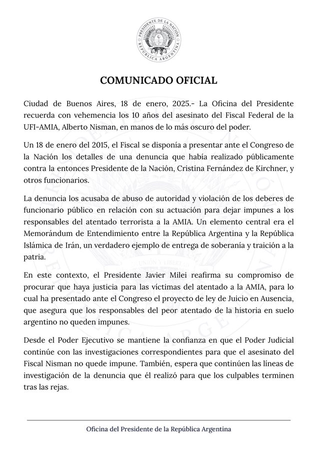 “La Oficina del Presidente recuerda con vehemencia los 10 años del asesinato del Fiscal Federal de la UFI-AMIA, Alberto Nisman, en manos de lo más oscuro del poder“, afirmó el Gobierno.