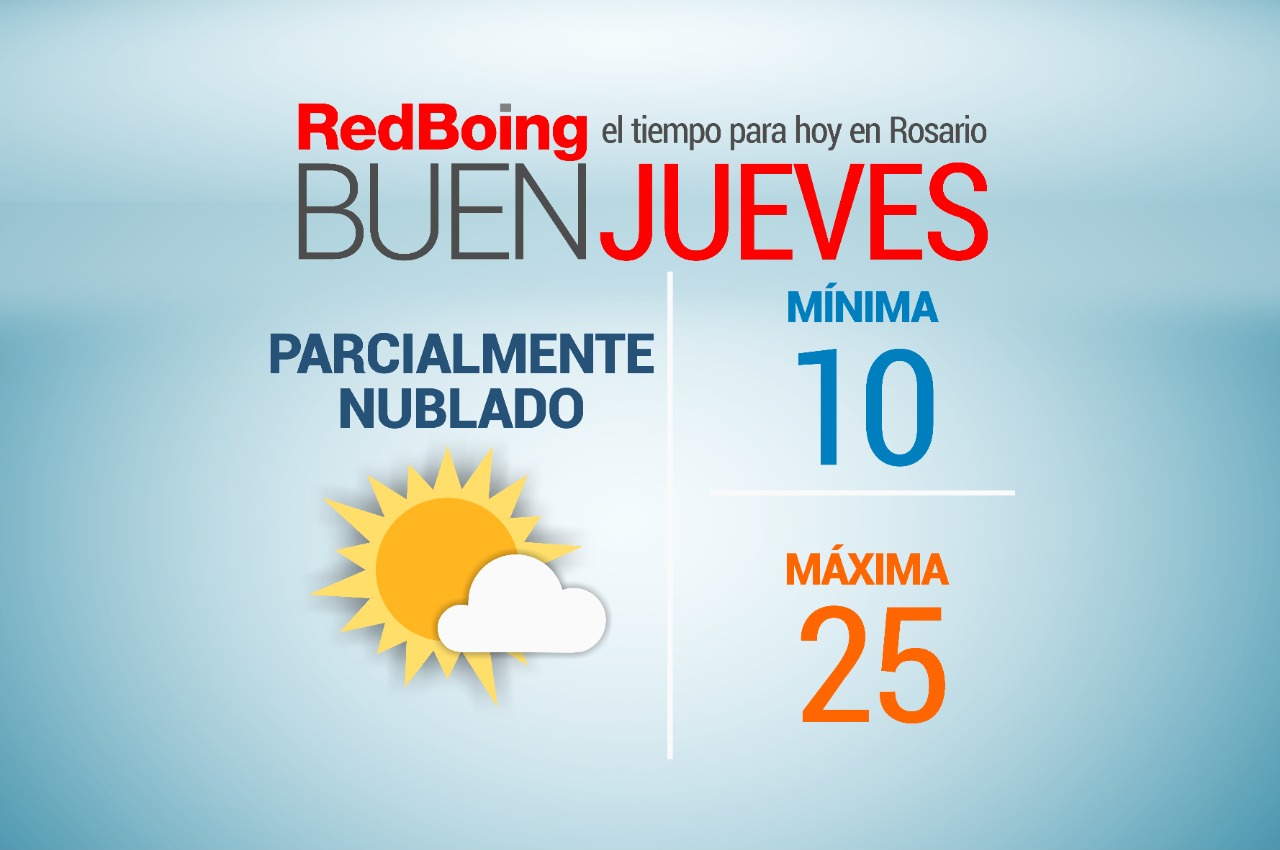 El Servicio Meteorológico Nacional informó que este jueves en la ciudad de Rosario será un día parcialmente nublado. Habrá una mínima de 10º y máxima de 25º. Por la mañana se espera una media de 19º y hacia el mediodía unos 22º.