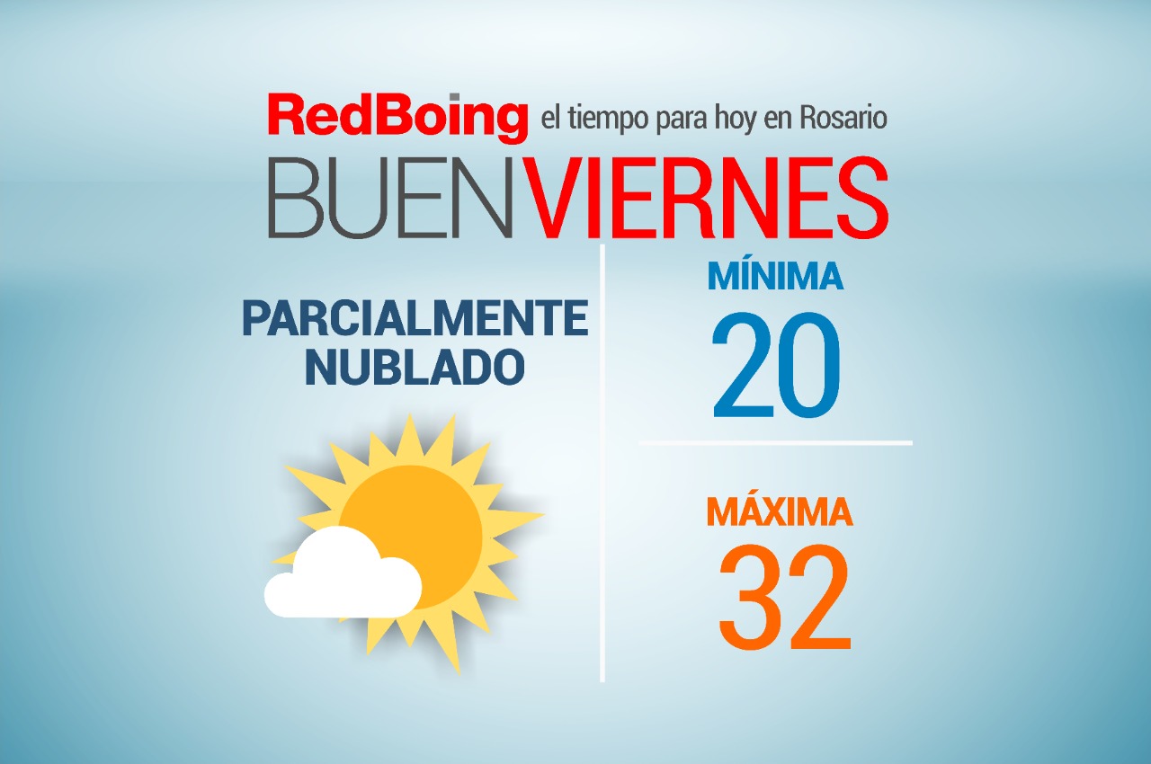 El Servicio Meteorológico Nacional informó que este viernes en la ciudad de Rosario será un día parcialmente nublado. Habrá una mínima de 20º y máxima de 32º. Por la mañana se espera una media de 26º y hacia el mediodía unos 30º.