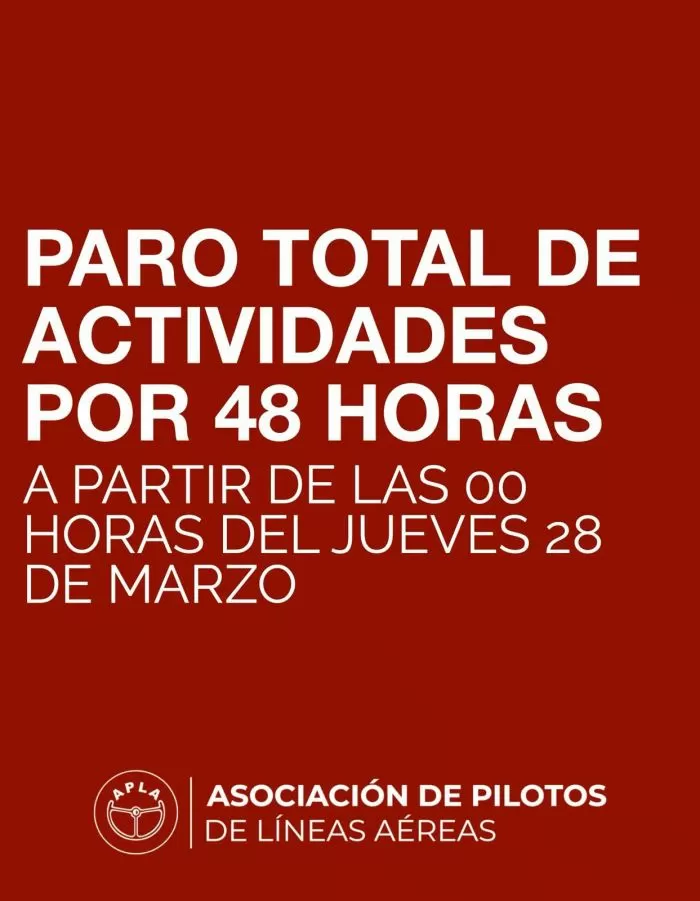 La Asociación de Pilotos de Líneas Aéreas anuncio un paro total de actividades el jueves 28 y viernes 29 de marzo. Vale recordar que esos días son el inicio del fin de semana extra largo de Semana Santa.