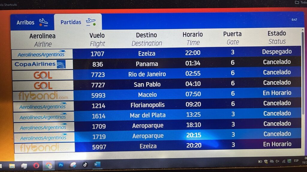Las aerolíneas GOL, Aerolíneas Argentinas y Copa Airlines tienen todos sus vuelos cancelados, tanto de salida como de llegada. Estos destinos son, por ejemplo, Panamá, Río de JAneiro, San Pablo, Florianópolis, Mar del Plata y Aeroparque.