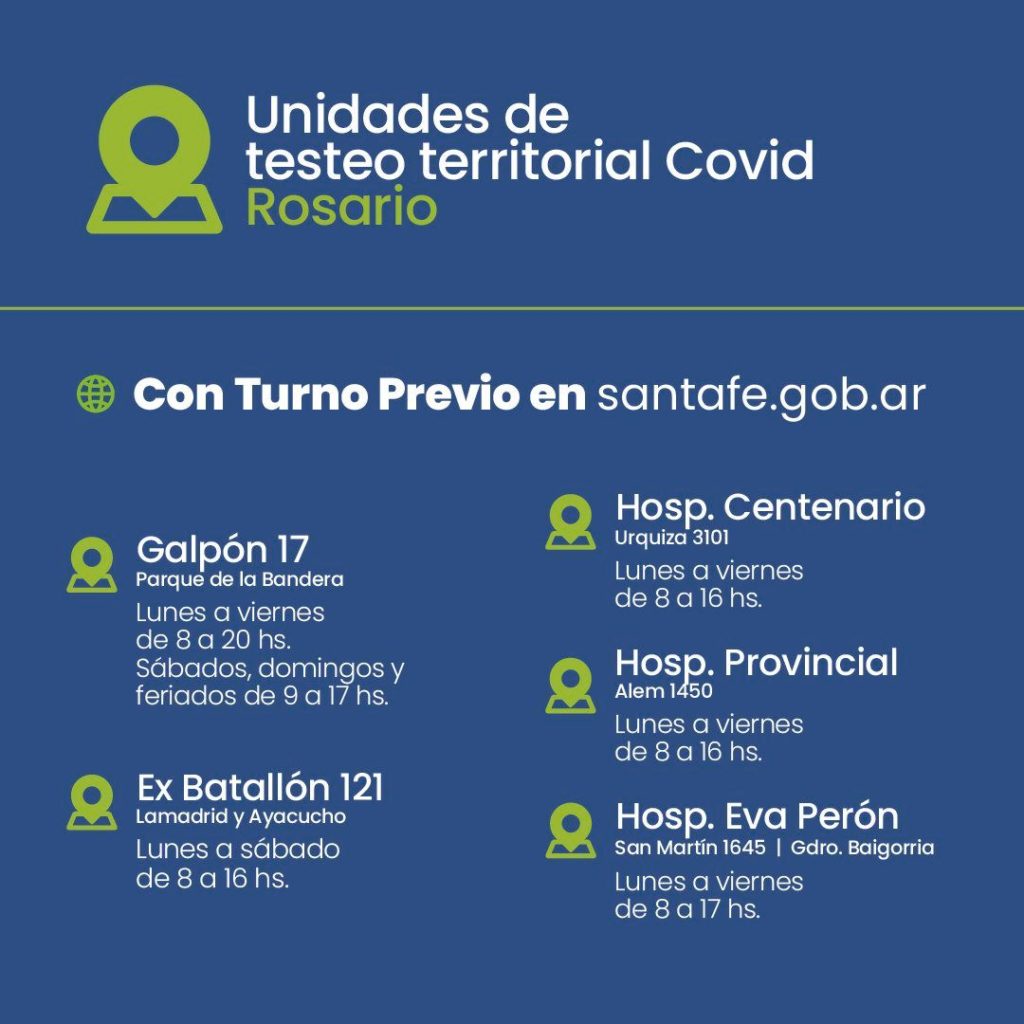 De esta manera, quienes deseen saber si poseen o no coronavirus deberán tramitar una plaza en los establecimientos disponibles a través del sitio oficial. En la página web, las oficinas que figuran son: el Galpón 17, el ex Batallón 121 y los tres hospitales: Eva Perón, Centenario y Provincial.