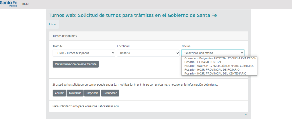 Tras clickear en la solapa color verde, la página automáticamente redireccionará al usuario a un formulario. En él, se deberá seleccionar el tipo de trámite –hisopados, API e ingresos brutos, entre otros- y la localidad. Luego de clickear en Rosario, se elegirá el centro de testeo deseado.