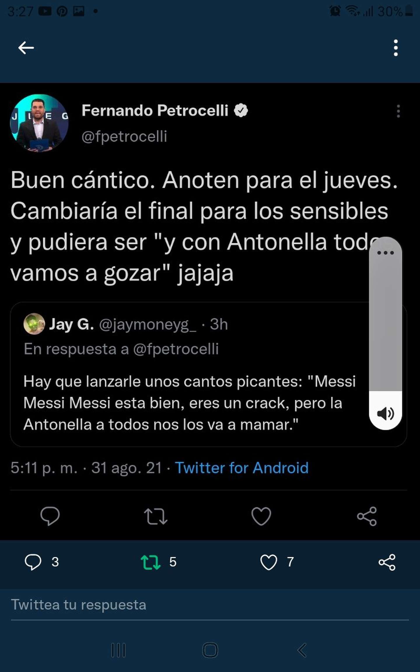 El periodista replicó el mensaje en sus redes y añadió: “Buen cántico. Anoten para el jueves. Cambiaría el final para los sensibles y pudiera ser ‘y con Antonela todos vamos a gozar’ jajaja”. El mensaje ya no puede verse en la cuenta del periodista, aunque sí la reprodujo el fiscal Saab en esa misma red social.