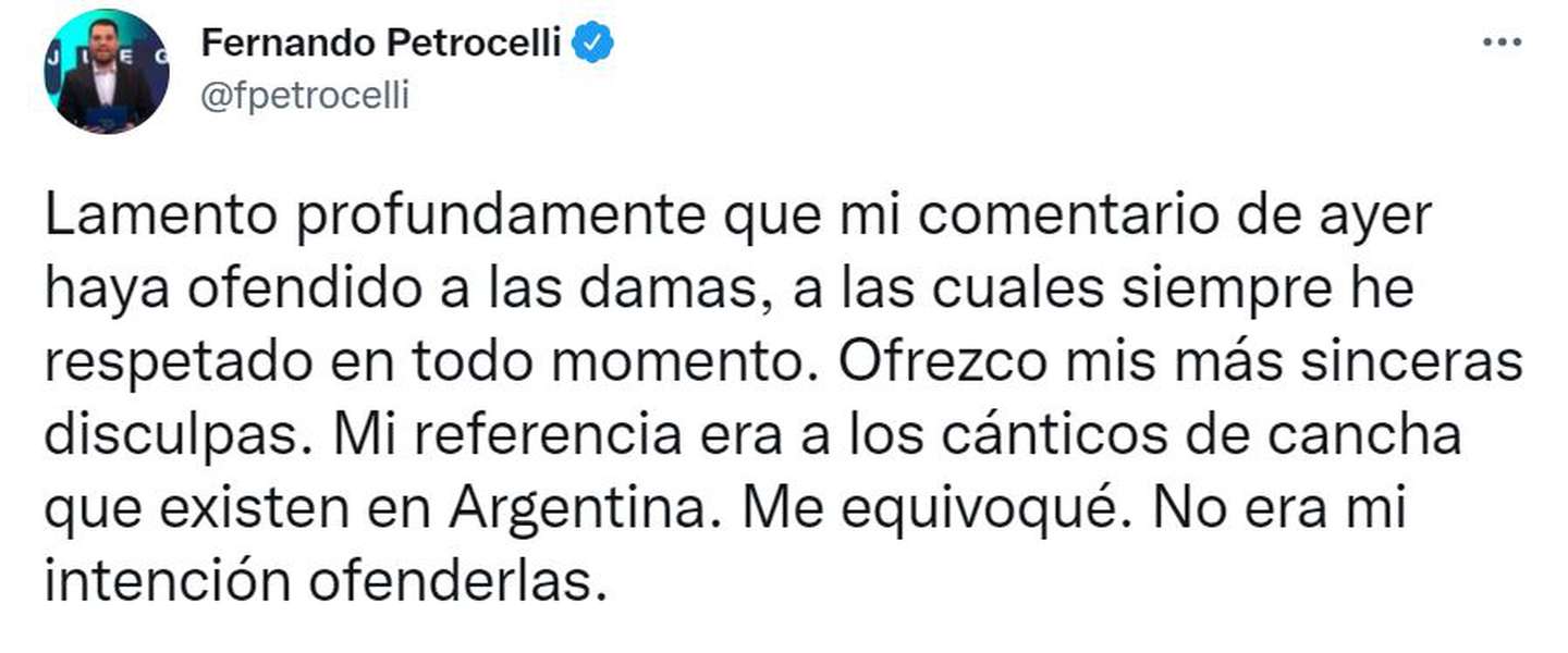 El periodista venezolano de 37 años borró su comentario sobre Antonela Rocuzzo y ofreció sus disculpas antes de la orden del fiscal venezolano. Y dijo: “Lamento profundamente que mi comentario de ayer haya ofendido a las damas, a las cuales siempre he respetado en todo momento. Ofrezco mis más sinceras disculpas. Mi referencia era a los cánticos de cancha que existen en Argentina. Me equivoqué. No era mi intención ofenderlas”.