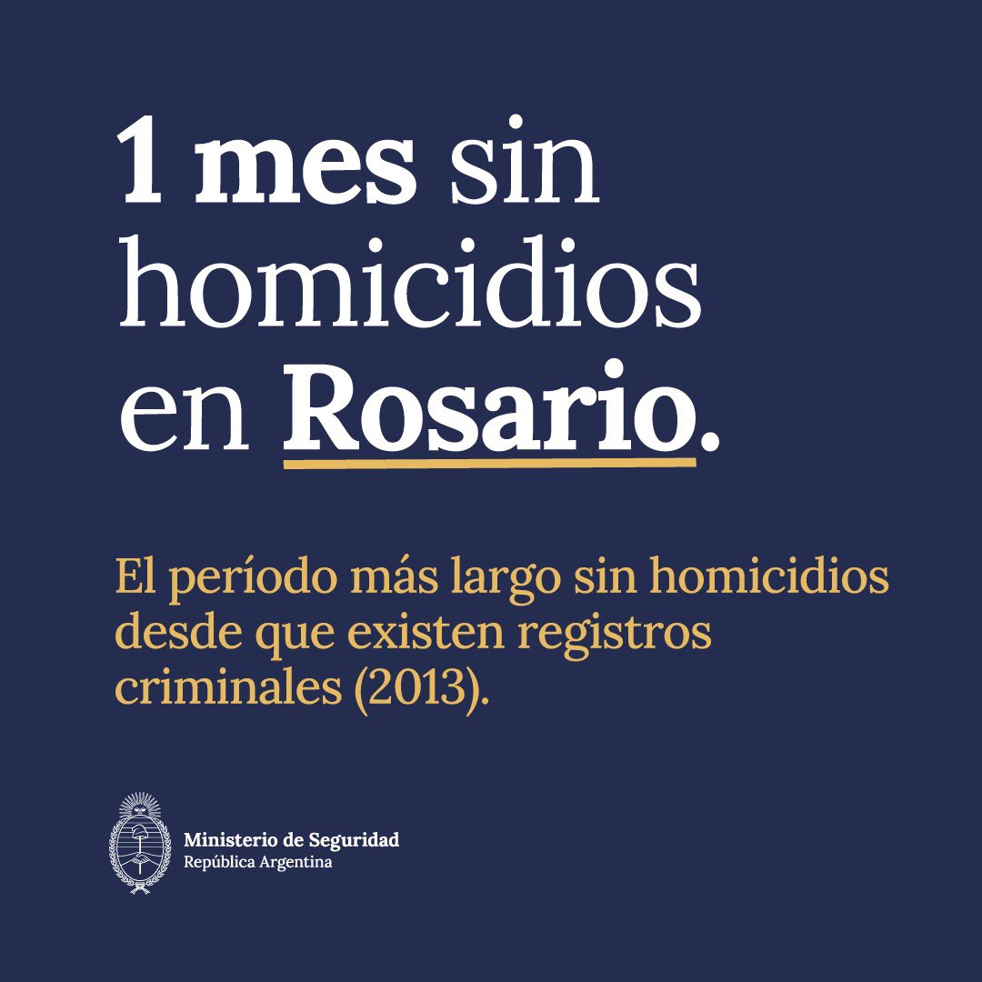 El ministerio de Seguridad de la Nación destacó que durante el último mes no se registraron homicidios en la ciudad de Rosario. Desde la cartera comandada por Patricia Bullrich, informaron que este registro estadístico no se daba desde el año 2013 en la ciudad.