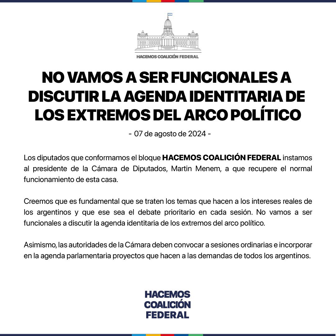 A diferencia del peronismo y la izquierda, quienes acudieron a la Cámara de Diputados, pero no se sentaron en sus bancas para garantizar la falta de quórum en la sesión de este miércoles, el bloque Hacemos Coalición Federal -presidido por Miguel Ángel Pichetto- ni siquiera asistió al recinto.