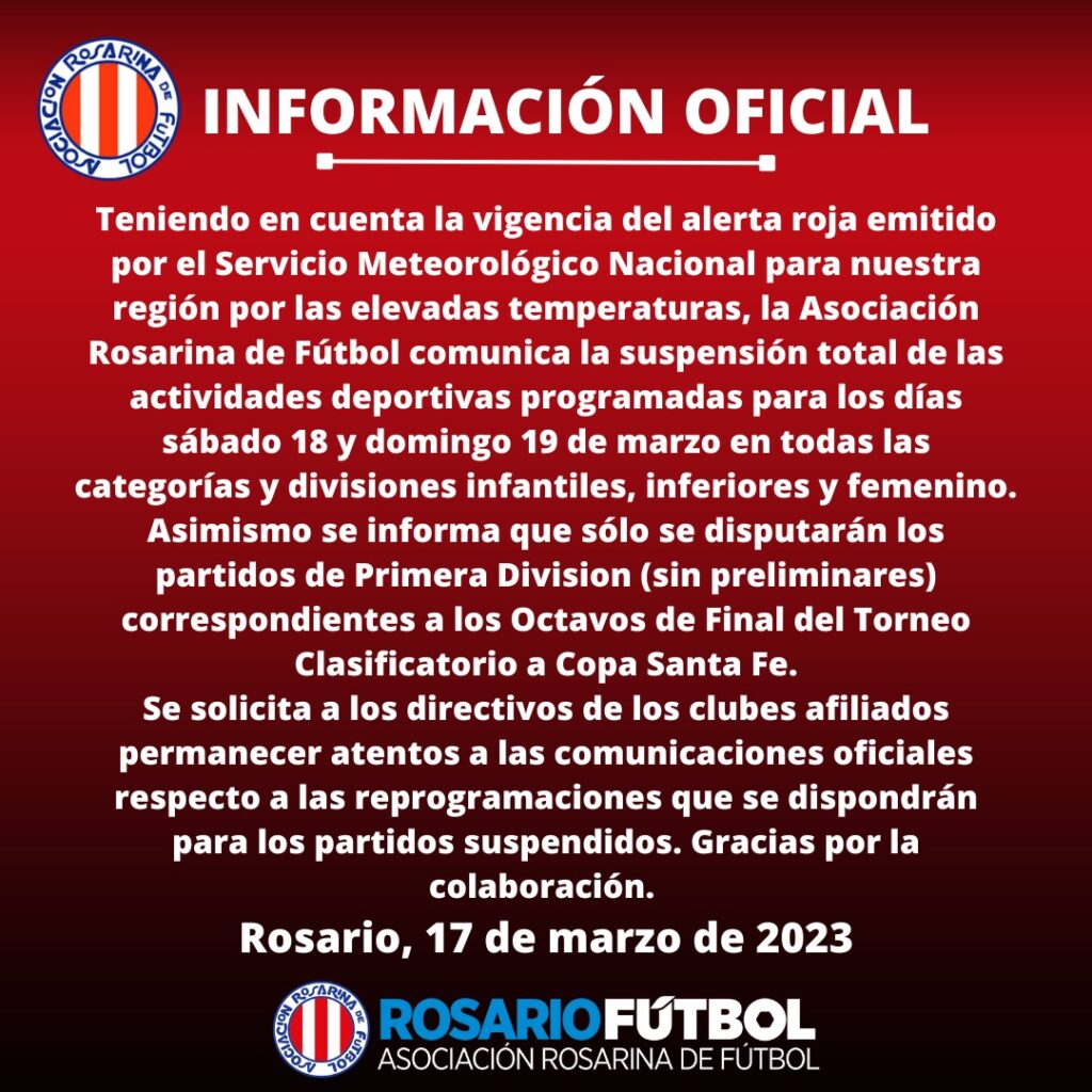 “Teniendo en cuenta la vigencia del alerta roja emitido por el Servicio Meteorológio Nacional para nuestra región por las elevadas temperaturas, la Asociación Rosarina de Fútbol comunica la suspensión total de las actividades deportivas programadas para los días sábado 18 y domingo 19 de marzo en todas las categorías y divisiones infantiles, inferiores y femenino”, comenzaron detallando a través de un comunicado.