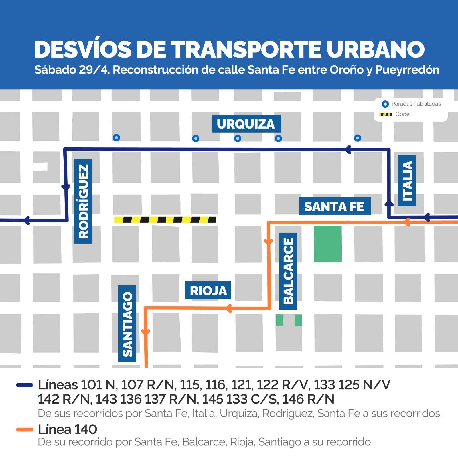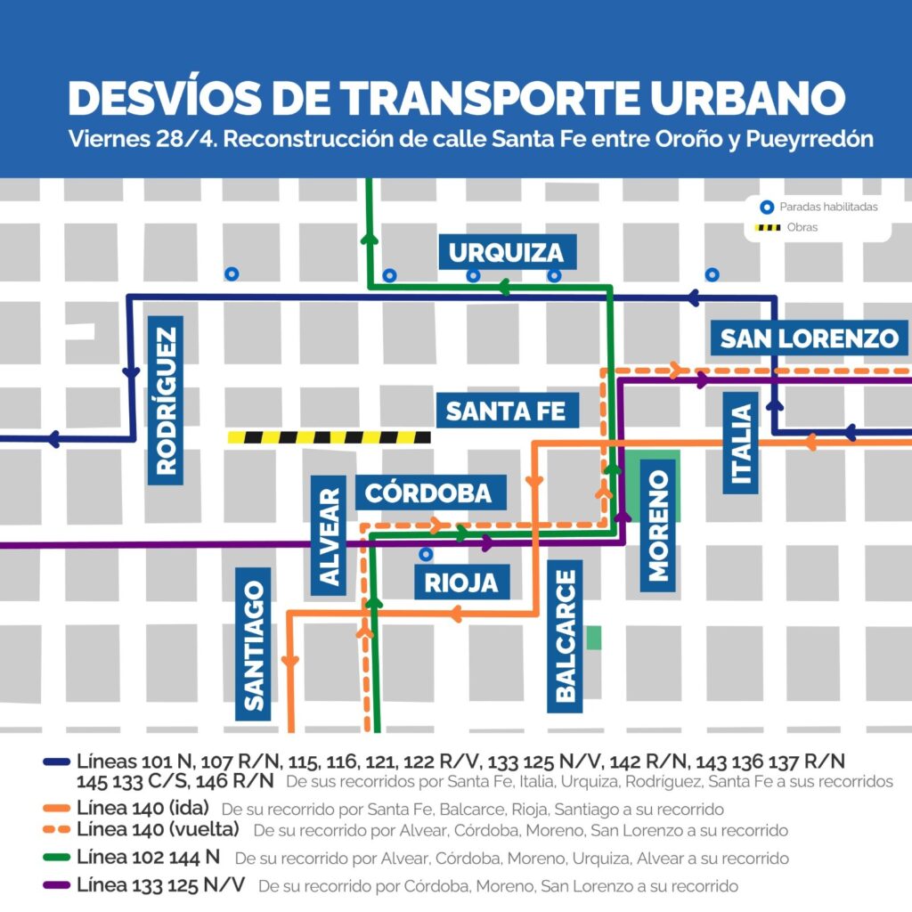 Debido a la reconstrucción de calle Santa Fe, el viernes 28 y sábado 29 de abril, de 10 a 18hs., se producirá corte total de calzada en Santa Fe entre Bv. Oroño y Pueyrredón; además se intervendrán las intersecciones de Santa Fe y Alvear, de Santa Fe y Santiago, y la de Santa Fe y Pueyrredón; por tal motivo algunas líneas de transporte urbano de pasajeros (TUP) deberán desviar sus recorridos habituales como también modificarán sus paradas de ascenso y descenso de pasajeros.