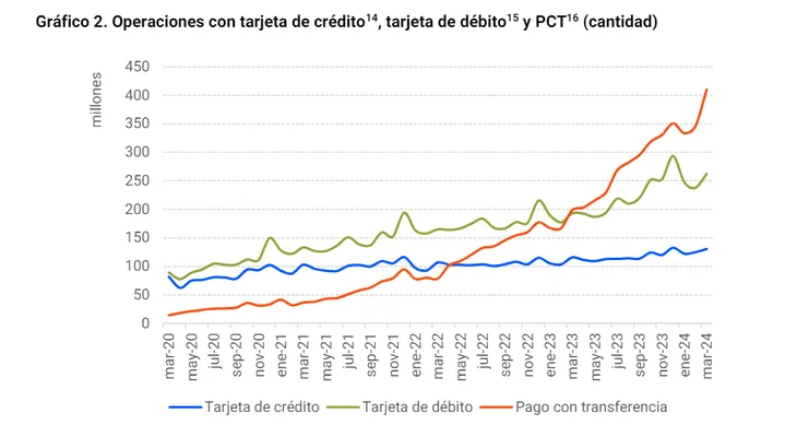 La información oficial muestra que en el tercer mes de 2024 las transacciones realizadas con transferencia superaron los 400 millones. En cambio, las compras abonadas con tarjetas de débito y crédito sumaron 393 millones.