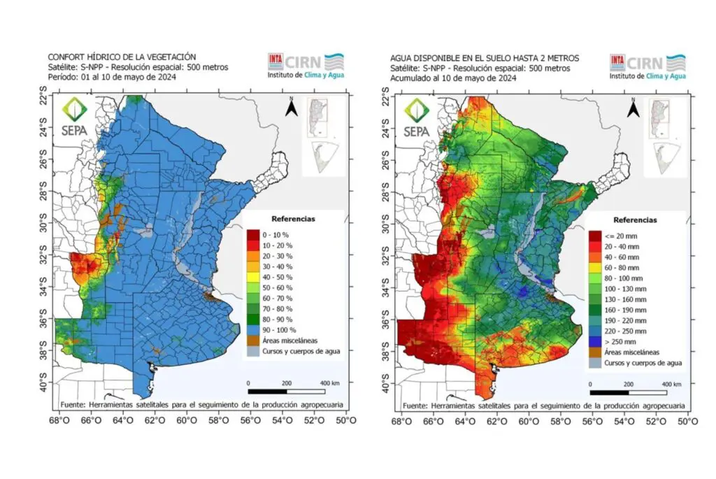 El balance hídrico generado por SEPA muestra, al final de períodos decadales, el contenido hídrico de los suelos hasta 2 metros de profundidad, o menor según las limitantes de suelo presentes. Ese contenido se traduce en cuatro productos: Agua disponible en el suelo con respecto al máximo posible en hasta 2 metros -representa la relación porcentual entre el contenido de agua disponible para la vegetación que tiene el perfil y la capacidad potencial del suelo para retener agua disponible-; agua disponible en el en suelo en hasta 2 metros -muestra el contenido de agua disponible para la vegetación (expresado en mm) al final del período informado-; variación del agua disponible -evalúa el cambio en el agua disponible (expresado en mm) al final de un período decadal con respecto al final del período anterior; y Confort Hídrico -relación entre el agua que transpiró la vegetación, que puede estar restringida por la disponibilidad en el suelo, y la demanda transpiratoria, que depende de la demanda atmosférica y la cobertura verde.