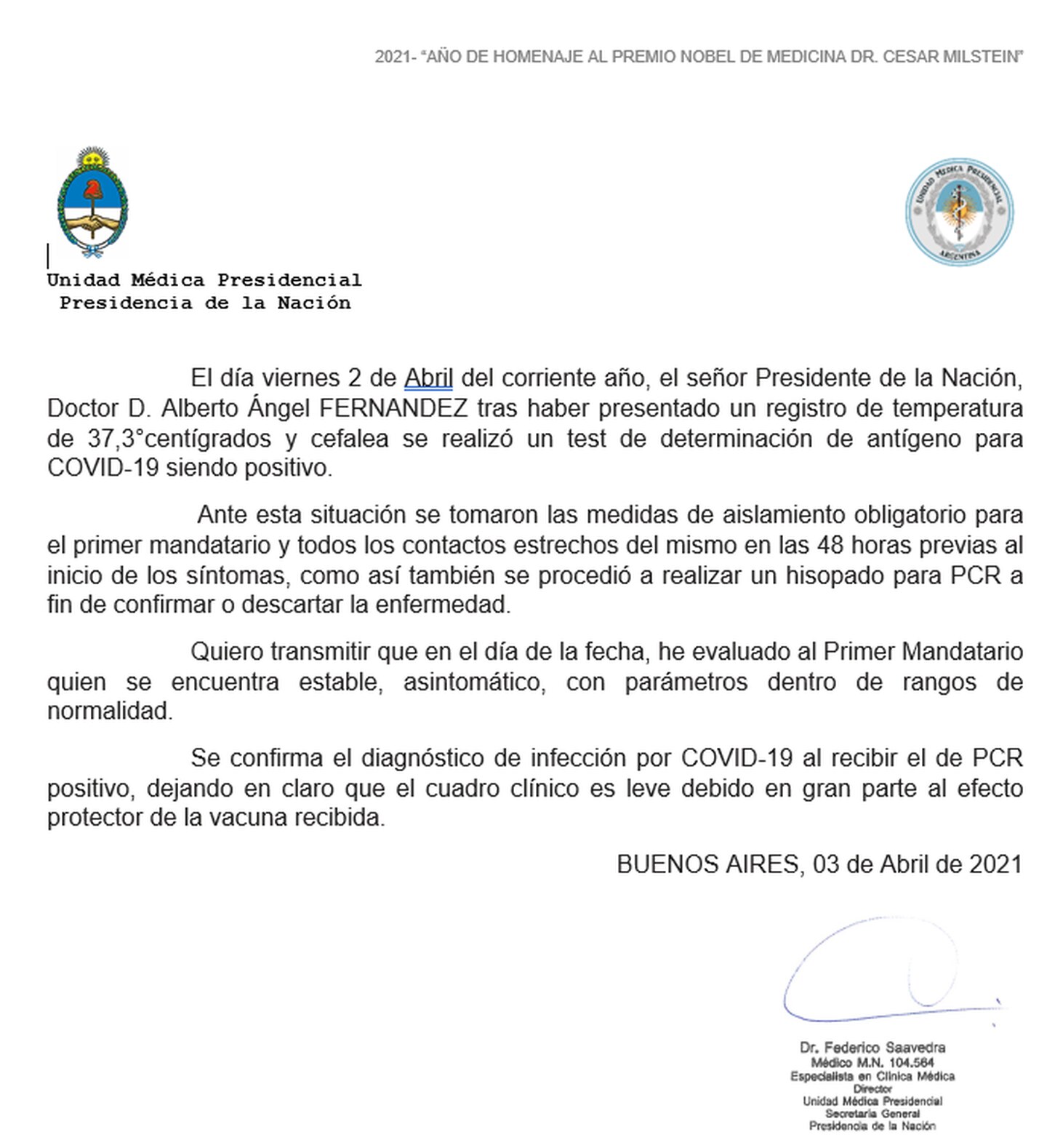 “El día viernes 2 de Abril del corriente año, el señor Presidente de la Nación, Doctor D. Alberto Ángel FERNANDEZ tras haber presentado un registro de temperatura de 37,3°centígrados y cefalea se realizó un test de determinación de antígeno para COVID-19 siendo positivo.