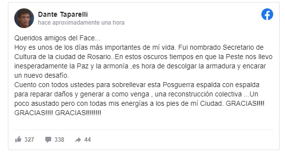 La primera modificación que realiza el Gobierno local conducido desde le Palacio de los Leones por Pablo Javkin fue confirmada en las últimas horas: la Psicopedagoga Carina Cabo renunció a la Secretaría de Cultura de la Municipalidad– se desempeñará en un nuevo programa de la Intendencia ligado a la capacitación de docentes de la UNR- y será reemplazada por el artista Dante Taparelli.