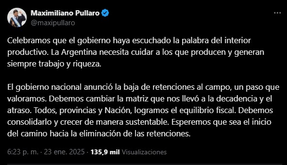 Minutos después de conocerse la noticia, el gobernador de la provincia destacó: “Celebramos que el gobierno haya escuchado la palabra del interior productivo. La Argentina necesita cuidar a los que producen y generan siempre trabajo y riqueza”, indicó el santafesino Maximiliano Pullaro.