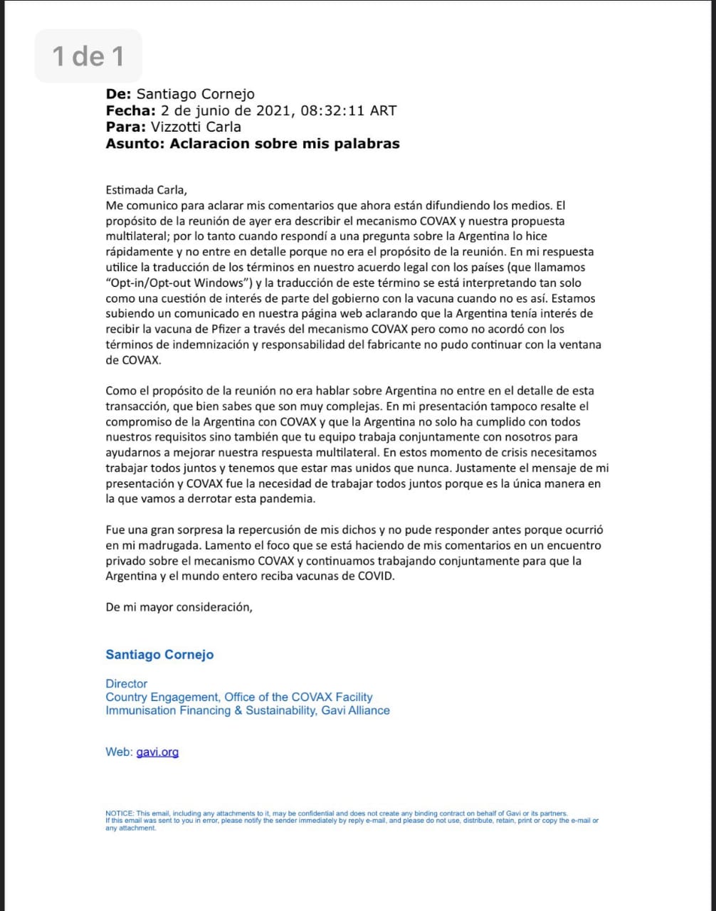 No obstante, este miércoles el representante del fondo COVAX en latinoamérica envió un correo electrónico a la ministra de Salud de la Nación, Carla Vizzotti, en el que aclaró sus dichos. “En mi respuesta utilicé la traducción de los términos en nuestro acuerdo legal con los países (que llamamos “Opt-in/Opt-out Windows”) y la traducción de este término se está interpretando tan solo como una cuestión de interés de parte del gobierno con la vacuna cuando no es así. Estamos subiendo un comunicado en nuestra página web aclarando que la Argentina tenía interés de recibir la vacuna de Pfizer a través del mecanismo COVAX, pero como no acordó con los términos de indemnización y responsabilidad del fabricante, no pudo continuar con la ventana de COVAX”, comenzó.