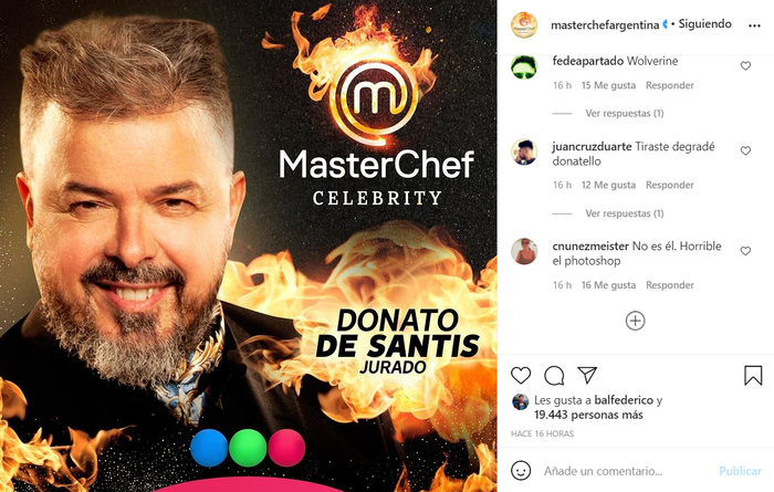 El posteo de Telefe en la cuenta de Instagram de “Masterchef Celebrity” expresa : “Queremos MÁS cocina, MÁS competencia ? @donatodesantis está listo para la #NuevaTemporada de #MasterChefArgentina”.
