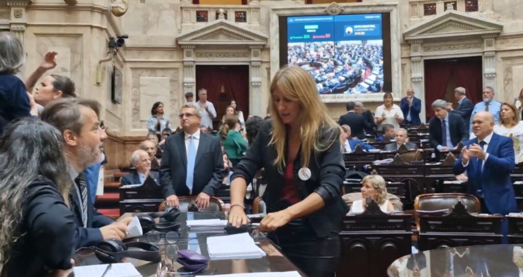 En medio del desorden, la diputada Florencia Carignano protagonizó un episodio que encendió aún más los ánimos: se acercó a la mesa central y comenzó a desconectar cables de alimentación e internet utilizados por los trabajadores del recinto.