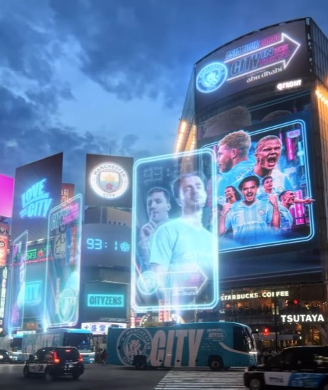 Con una especie de hologramas que sobresalían de las pantallas que cuelgan de los edificios, así fue la bienvenida para el conjunto inglés. Dentro de las figuras que aparecen en las imágenes está Julián Álvarez acompañado de Grealish, Stones, Haaland, Foden, Rodri y De Bruyne.