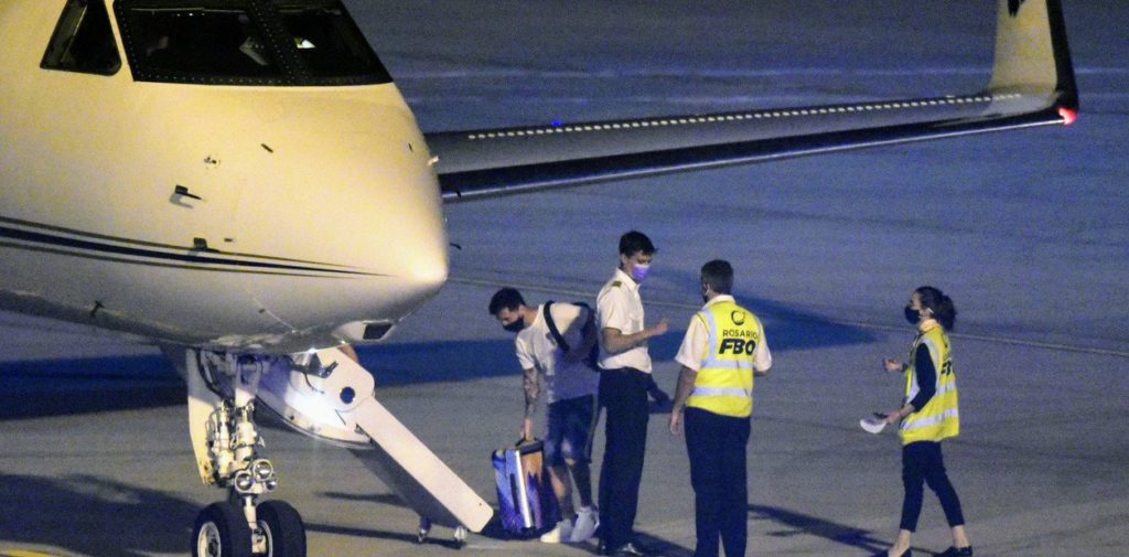El dirigido por Lionel Scaloni en la Selección abordó un avión de su flota privada en el aeropuerto de Fisherton junto a Antonela Roccuzzo y sus tres hijos con quienes estaba realizando el aislamiento en el country Mirasoles de Funes.