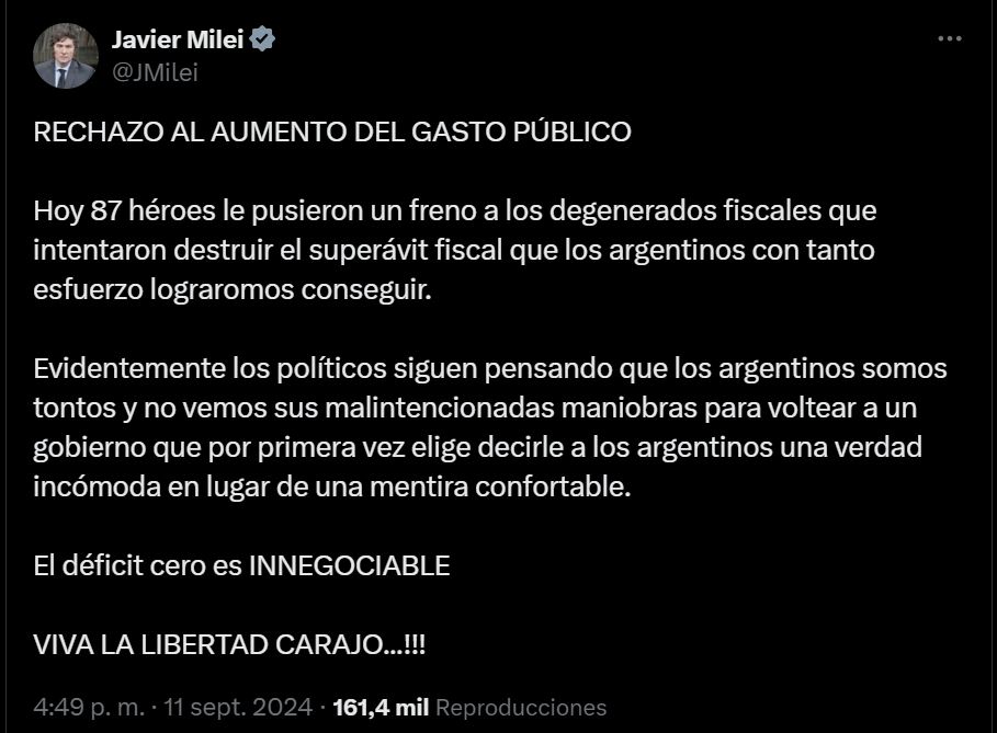 “Hoy 87 héroes le pusieron un freno a los degenerados fiscales que intentaron destruir el superávit fiscal que los argentinos con tanto esfuerzo logramos conseguir”, expresó Milei desde sus redes sociales.