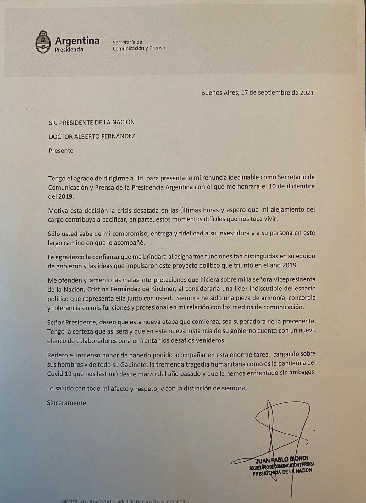 “Tengo el agrado de dirigirme a Ud. para presentarle mi renuncia indeclinable como Secretario de Comunicación y Prensa de la Presidencia Argentina, con el que me honrara el 10 de diciembre de 2019”, comenzó en el documento que lleva su firma. Y agregó: “Motiva esta decisión la crisis desatada en las últimas horas y espero que mi alejamiento del cargo contribuya a pacificar, en parte, estos momentos difíciles que nos toca vivir.