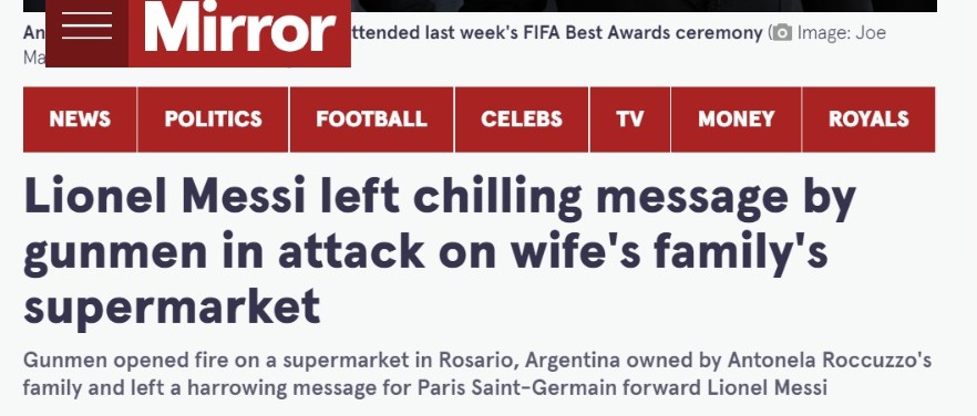 Uno de los primeros en exponer la situación a nivel internacional fue el periódico británico The Sun, que en su portada explicó: “Messi fue amenazado tras un ataque a tiros contra el supermercado de la familia de su esposa”.