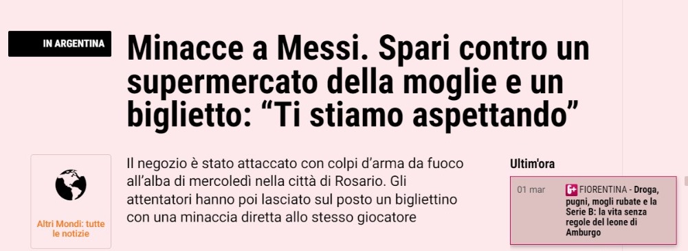 “Amenazas a Messi. Tiroteos contra el supermercado de su esposa y una nota: ‘Te esperamos'”, tituló el diario italiano Gazzetta. Cabe destacar que este es uno de los principales medios de comunicación del país europeo.