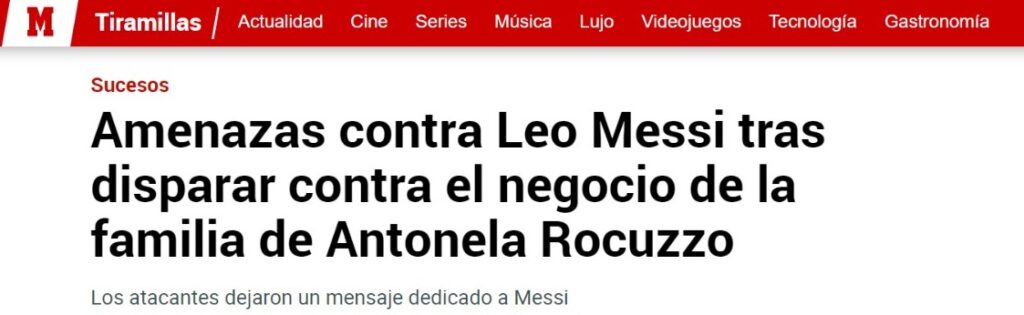 “Amenazas contra Leo Messi tras disparar contra el negocio de la familia de Antonela Rocuzzo”, sostuvo el Diario Marca, uno de los más prestigiosos en el ámbito deportivo a nivel mundial.